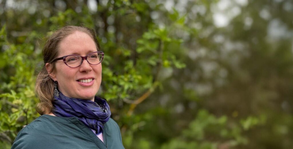 Porträt von Ondine Delavelle, Trainerin für empathische Führung und Reflexionsräume für Führungskräfte, die nachdenklich in die Ferne schaut.